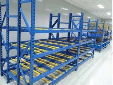 流利式貨架又稱滑移式貨架,采用輥輪鋁合金,鈑金等流利條,利用貨物臺架的自重,從一邊通道存貨,另一邊通道取貨實現(xiàn)先進先出,存儲方便,以及一次補貨多次取貨。流利貨架是存儲配送環(huán)節(jié)中不可缺少的設(shè)備,普通貨架只能單純的滿足貨物擺放的需求,相比之下,流利式貨架的獨特結(jié)構(gòu)可主動滿足先進先出的要求。